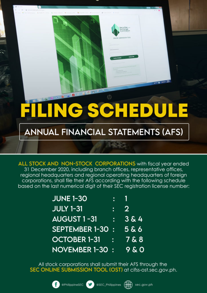 Basahin ang SEC Memorandum Circular No. 3, Series of 2021 para sa ibang impormasyon ukol są schedule at procedure ng filing ng mga annual report: https://www.sec.gov.ph/mc-2021/mc-no-03-s-2021/.